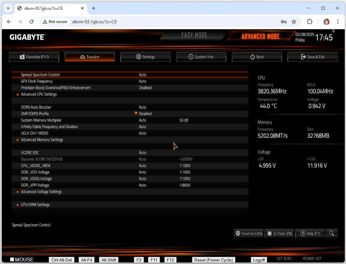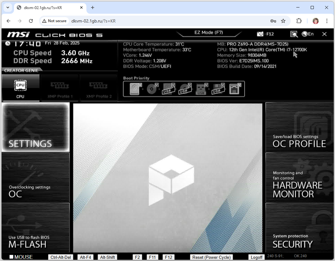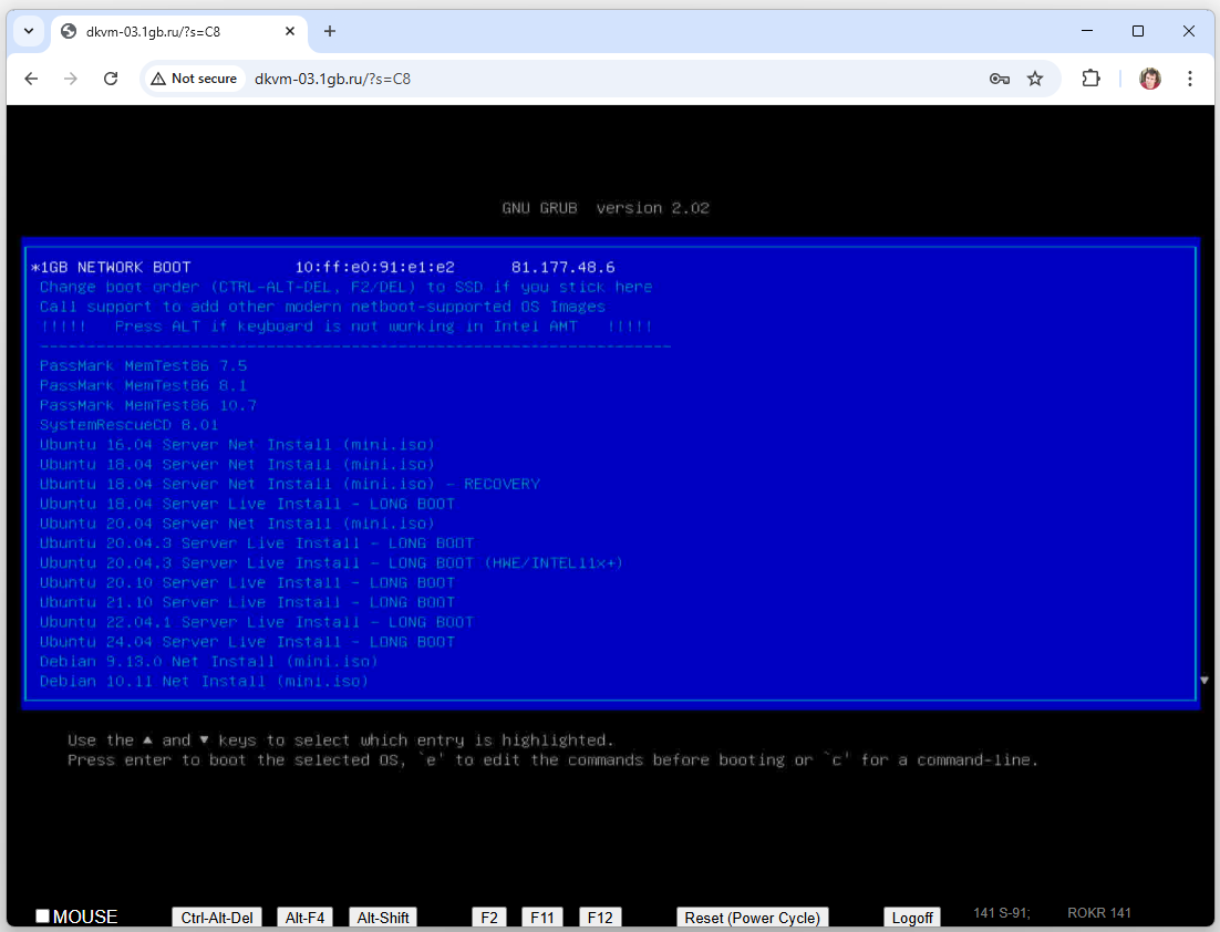 Администрирование сервера - BIOS и загрузка других ОСДля того, чтобы обслуживать ОС сервера (устанавливать или чинить), вам потребуется физический экран сервера. Это как будто обычная клавиатура и экран компьютера, которые работают даже тогда, когда не работает ОС. У физического сервера удаленный доступ к такому экрану и клавиатуре называется KVM. Если ваш сервер оснащен системой управления Intel AMT / IPMI, то KVM доступом выступает интерфейс Intel AMT / IPMI. Эта система встроена в саму аппаратуру сервера. Если ваш сервер не оснащен системой Intel AMT / IPMI, то KVM доступом выступает внешняя система, у нас она называется DKVM. В случае наших аппаратных серверов это работает через сайт типа http://dkvm-02.1gb.ru. Параметры доступа к AMT / IPMI или KVM указаны на странице личного кабинета, где перечислены ваши арендованные сервера. Порядок работы такой: