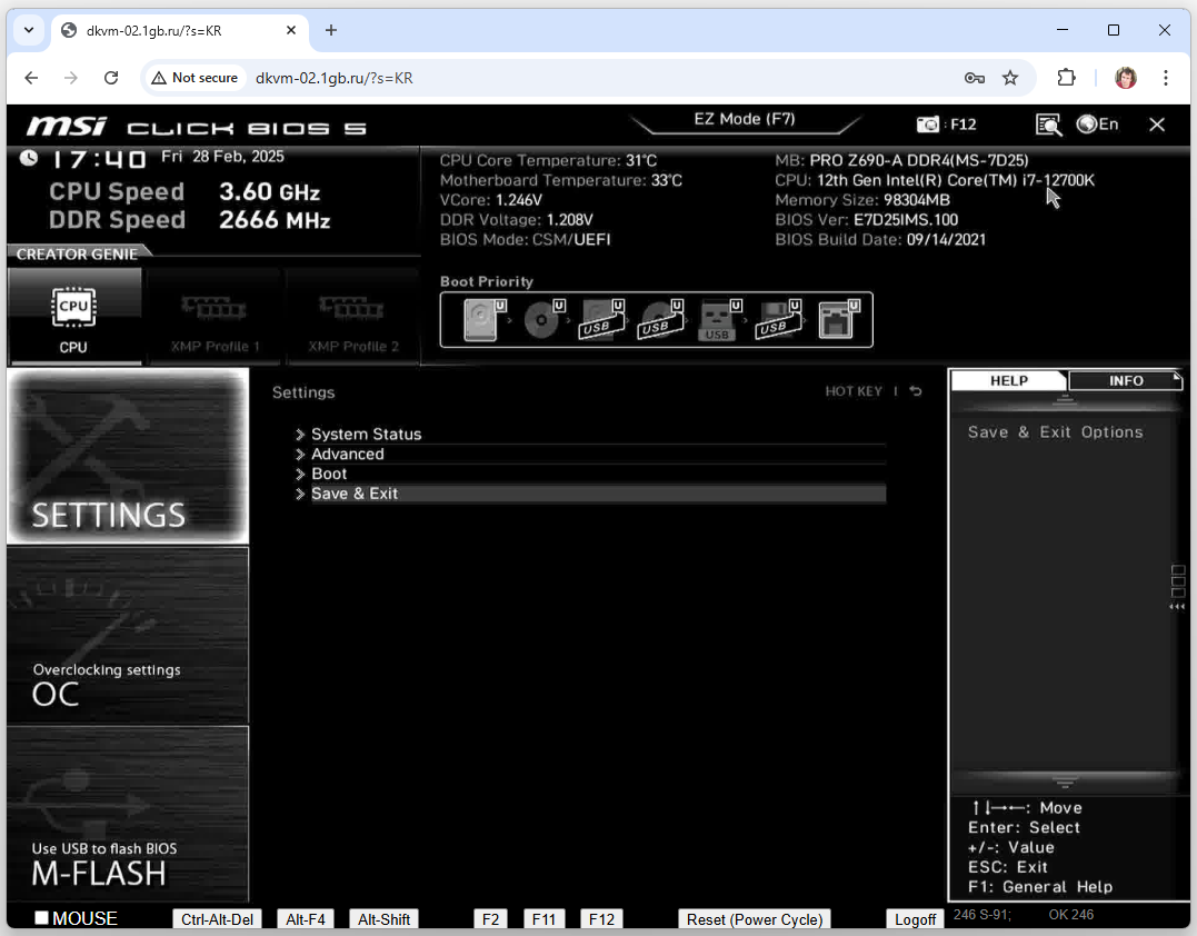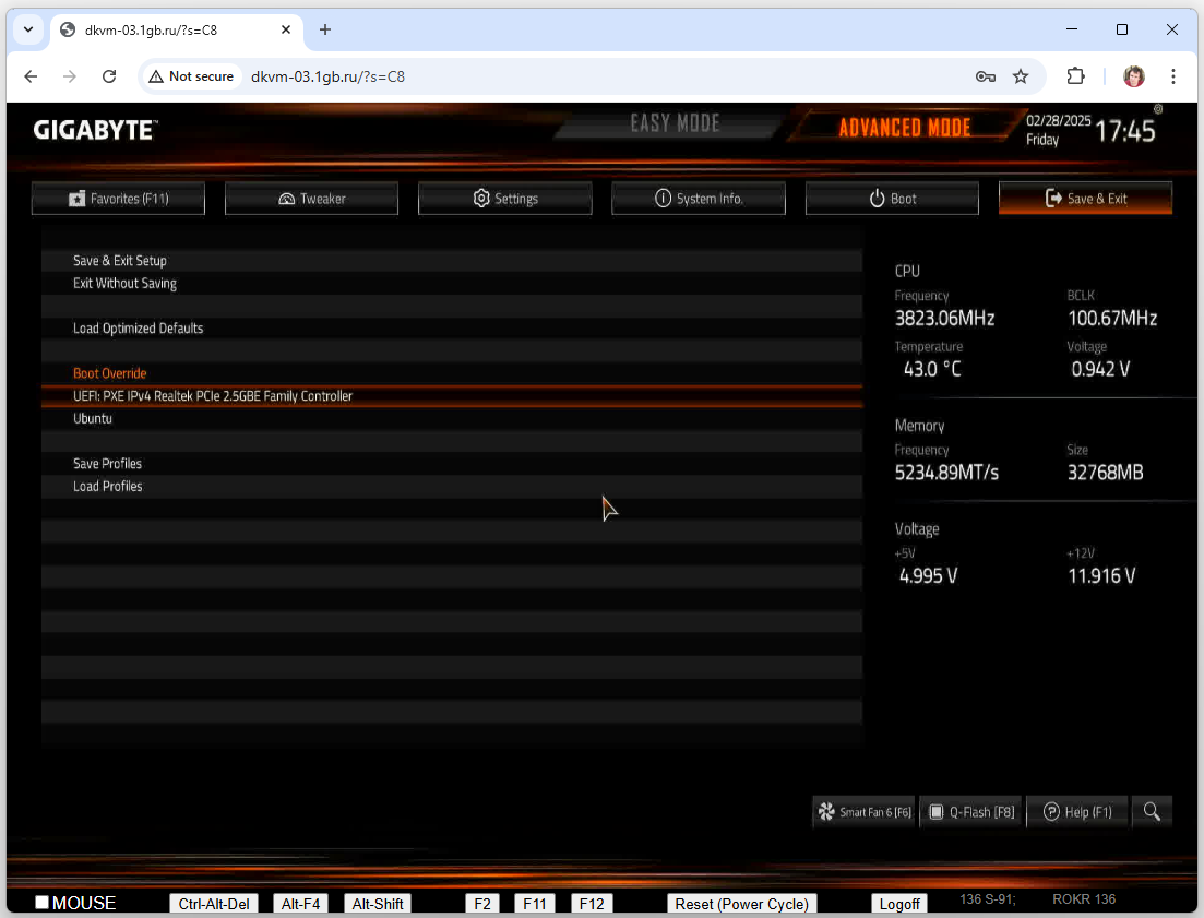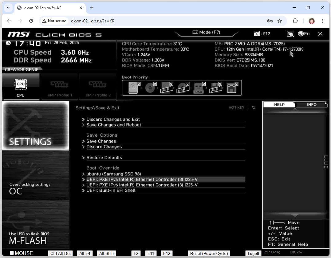 Настройка BIOS - не тема этой статьи, но ОЧЕНЬ ВАЖНЫЙ СОВЕТ - НЕ НУЖНО НИЧЕГО НИГДЕ ТАМ МЕНЯТЬ ИЛИ СБРАСЫВАТЬ НА ЗНАЧЕНИЯ ПО УМОЛЧАНИЮ. Вы можете потерять удаленный доступ к серверу, и его восстановление займет длительное время. В BIOS-е для выбора загрузки вам нужно проследовать в меню выхода. Порядок загрузки менять не надо! Просто найдите меню выхода. В нем есть опция одноразовой загрузки. Вам нужно выбрать загрузку через сеть, типа PXE IP V4. Это выглядит примерно так: