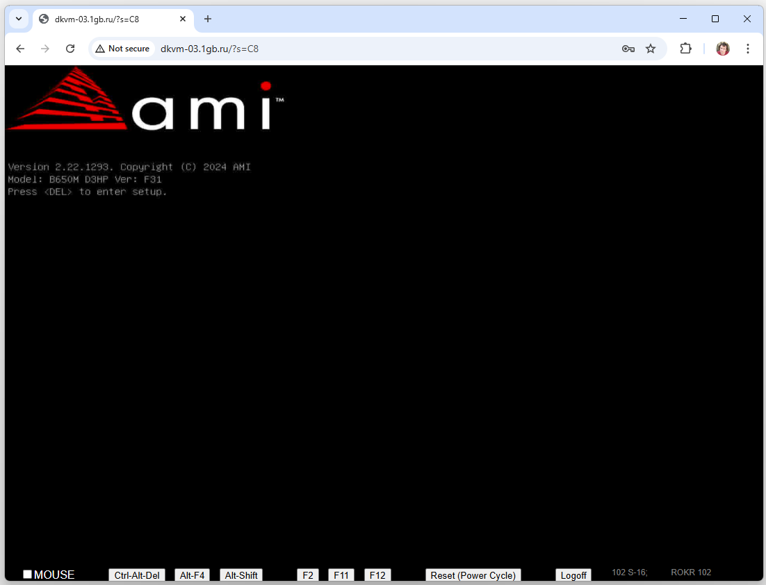Нужно войти в BIOS или меню загрузкиПерезагрузите сервер. Чаще всего сработает CTRL-ALT-DEL, и в AMT / IPMI, и в DKVM, есть соответствующие кнопки. При инициализации материнской платы вы увидите её заставку. Она может выглядеть примерно так: